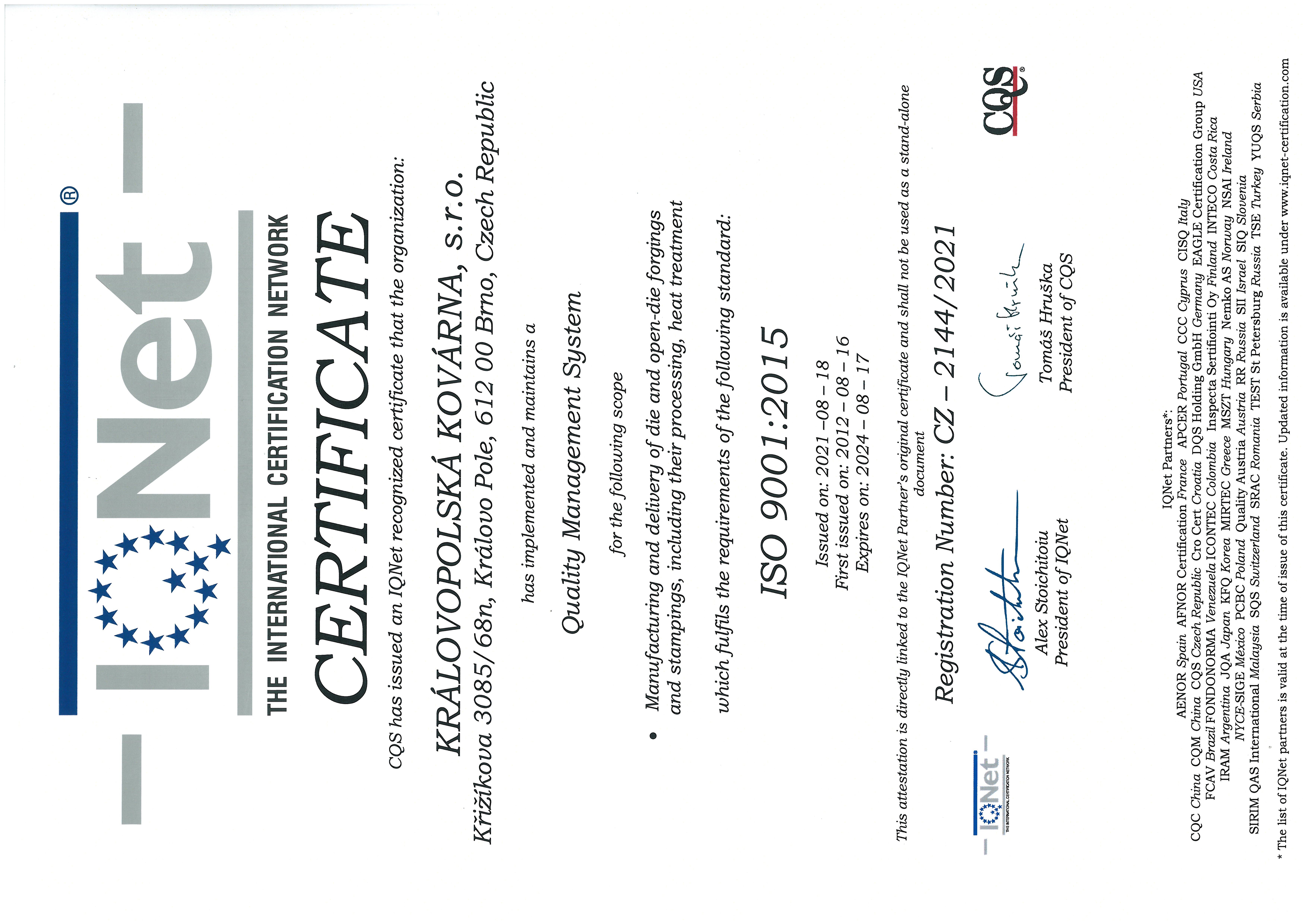 Certified quality management system according to ČSN EN ISO 9001:2015